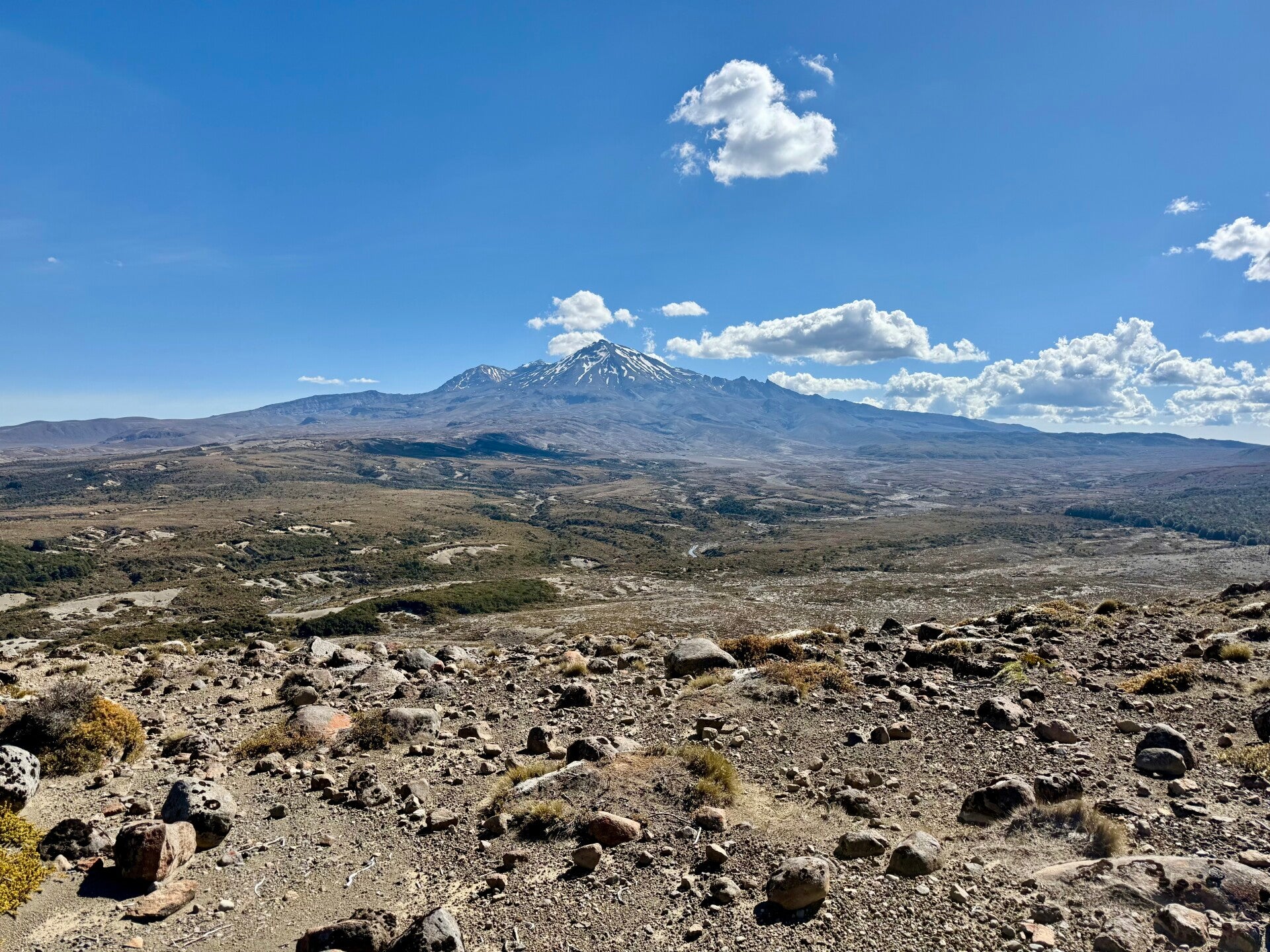 At the bottom of the slope, the path makes a right angle to the south. From here, vegetation consisting of yellowed grasses and a few low shrubs reappears in a kind of desert plain. To my right, I have Mount Ngauruhoe, and in my sights, the giant Reapehu, a 2,797-meter-high volcano whose peaks are still snow-capped. It's absolutely stunning! Since starting the trail some fifty days ago, this is the first time such a variety of spectacular landscapes have unfolded in a single day! I'm thrilled to know I have four days to explore it all and enjoy these wonders.