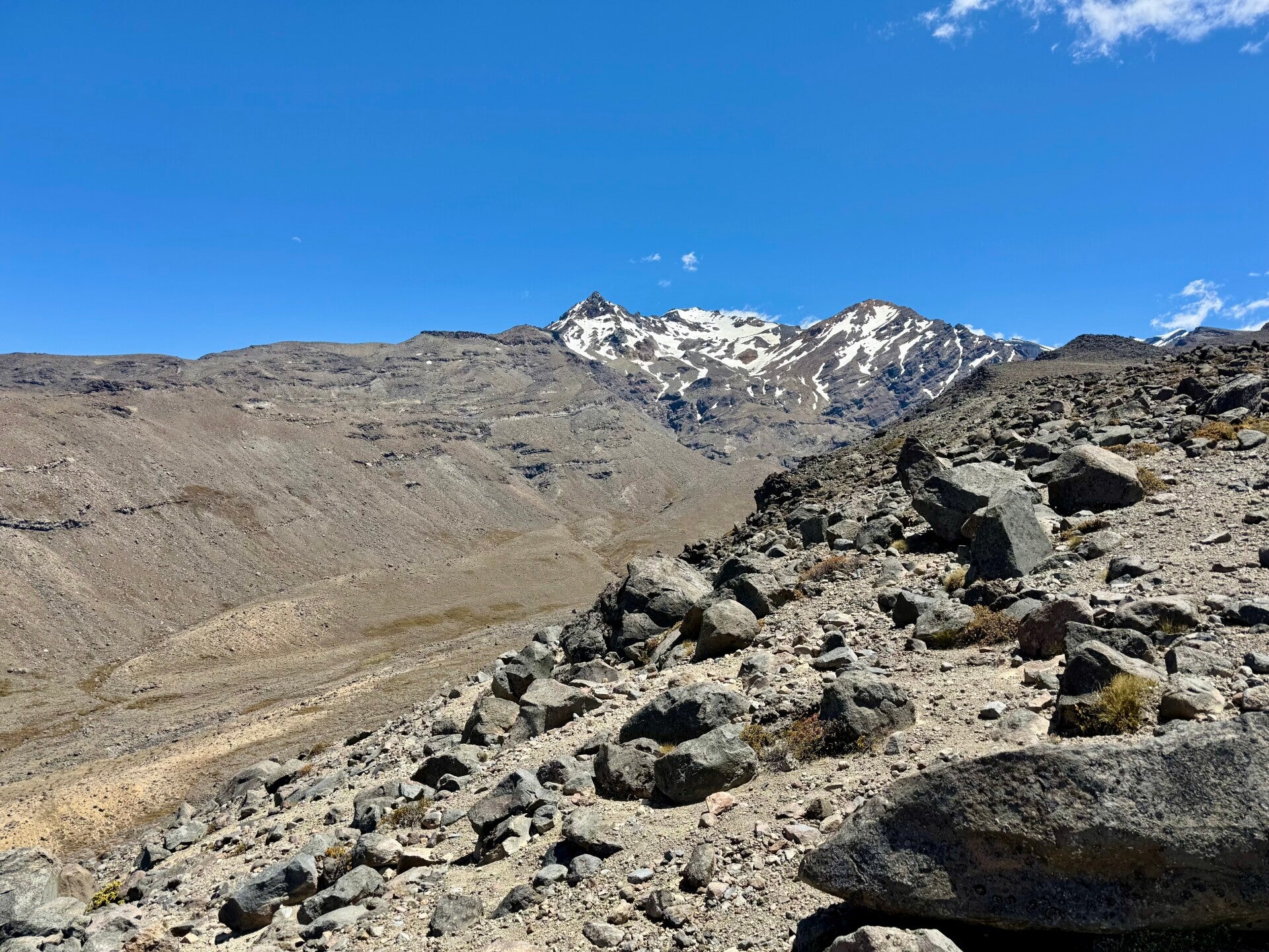 By circling the volcano clockwise, I'll be constantly on a slope, with my left foot as my main support—my left ankle is going to take a beating! On this side of the volcano, successive eruptions and flows of ash and mud have created a desert-like surface, partly sandy, partly rocky; this section is even called the Rangipo Desert. A little to my left, opposite me, is Mount Ruapehu. Turning around, I see Mount Ngauruhoe, and in the middle, this arid plain dotted with a few streams and sparse vegetation.