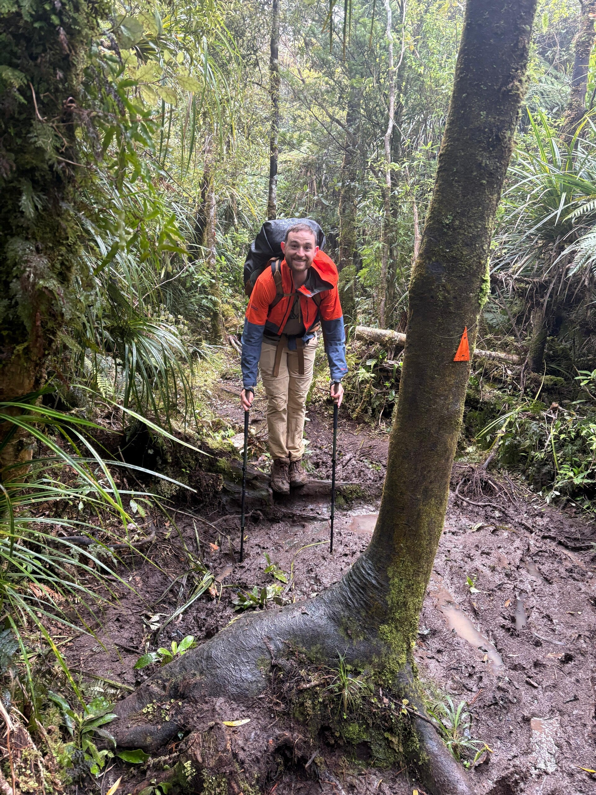 The crossing ahead of us today looks difficult. Much like Ninety Mile Beach, the Raetea forest is legendary in the Te Araroa community. The accounts of those who have already crossed it are sometimes daunting: "mud up to our knees," "12 to 14 hours to reach the end," "the muddiest section of these 3,000 km," "repeated falls"... After breakfast, we set off at 5:45 a.m. with our headlamps, even though we won't be using them for very long. We walk along the edge of the forest, not yet under the canopy of trees, and dawn is already breaking, easily revealing the path ahead. The weather seems clear, the sky gradually losing its stars in favor of still-timid colors.After winding along a path for three-quarters of an hour, we enter the forest. The path gives way to a trail, which itself disappears, leaving only a sort of more or less clear passage in the middle of a seemingly impenetrable forest. Mud begins to appear, at first occasionally, then repeatedly, before becoming omnipresent. Countless roots also join the party. The peaks of the mountain range don't seem very high, 744 meters for the highest point of Raetea. But with a trail like this, we understand that it will indeed take us a long time to get through it. We climb a steep slope, stepping over high roots, constantly trying to avoid the mud, and we bless our hiking poles, which give us more stability. We decide to start a competition to see who will fall the most. Five minutes later, I open the scoring with a magnificent sequence: a back slide, a kind of pathetic triple axel, and a back-first landing in the mud. We're in stitches !