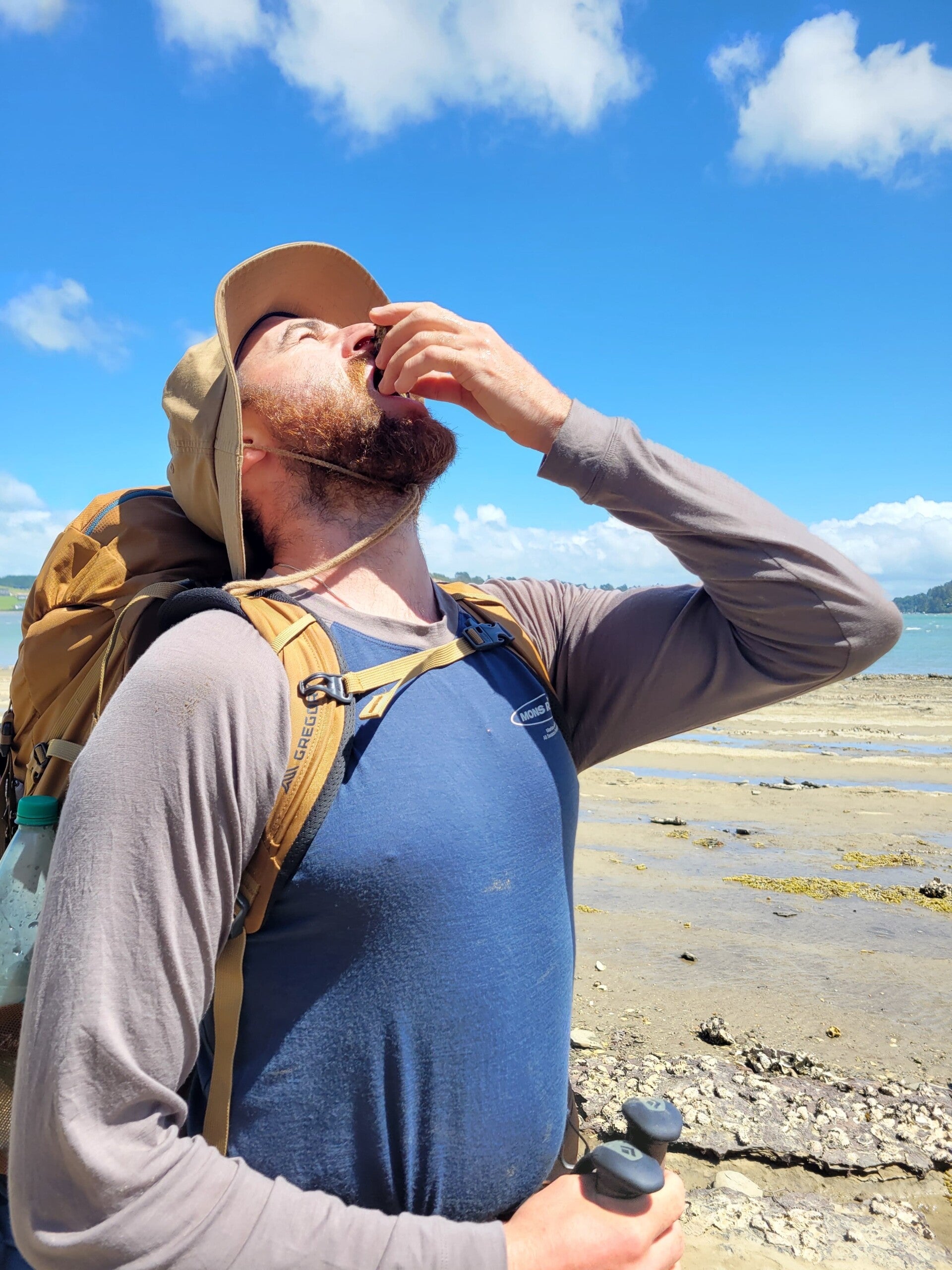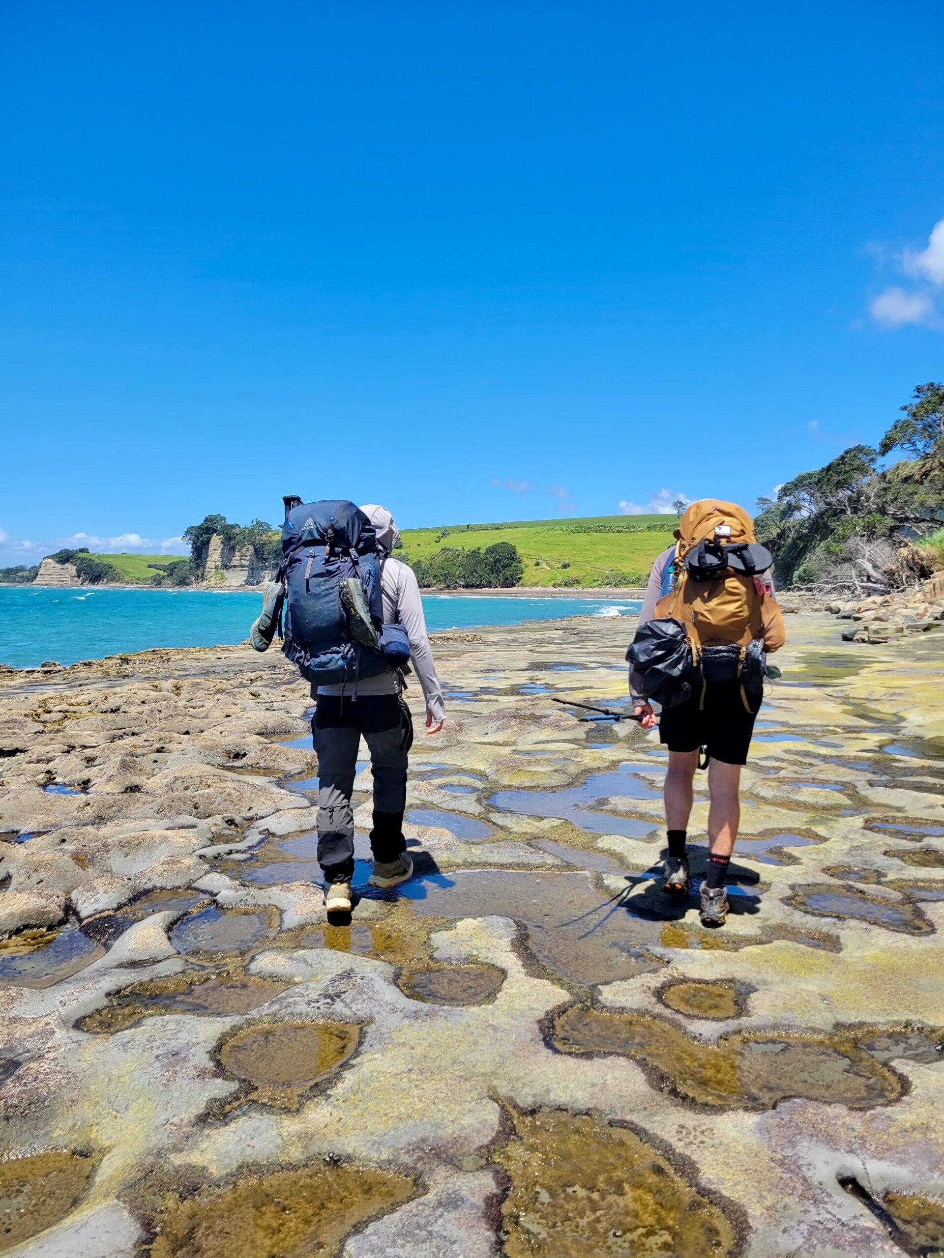 Après avoir atteint le petit village de Stillwater, je m’engage le long d’un sentier côtier de 4 kilomètres. En arrivant au bout, je rejoins une petite troupe de 10 randonneurs qui attendent patiemment la marée descendante pour franchir l’estuaire de Okura. Avec son kilomètre de largeur, le traverser est relativement aisé, ses eaux étant peu profondes sauf sur une portion d’une centaine de mètres de largeur où l’eau nous arrive au dessus des hanches. En faisant sécher nos habits sur un arbre échoué après le franchissement de l’estuaire, nous avons l’air de rescapés d’un naufrage.