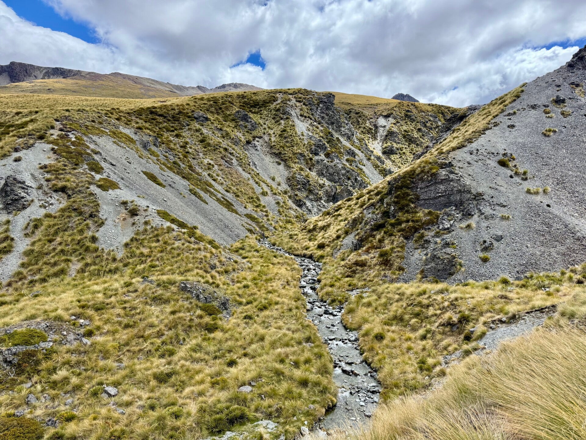 Le chemin serpente trois kilomètres le long du lac Ōhau avant de tourner à gauche et de grimper une pente sur huit kilomètres en douceur. Le sentier qui passe dans la forêt possède des airs des Vosges, bien entretenu et parfois en courts lacets. Nous sortons ensuite de la forêt et montons sur les sommets nus, rocheux et garnis d’herbes jaunies comme à l’habitué.