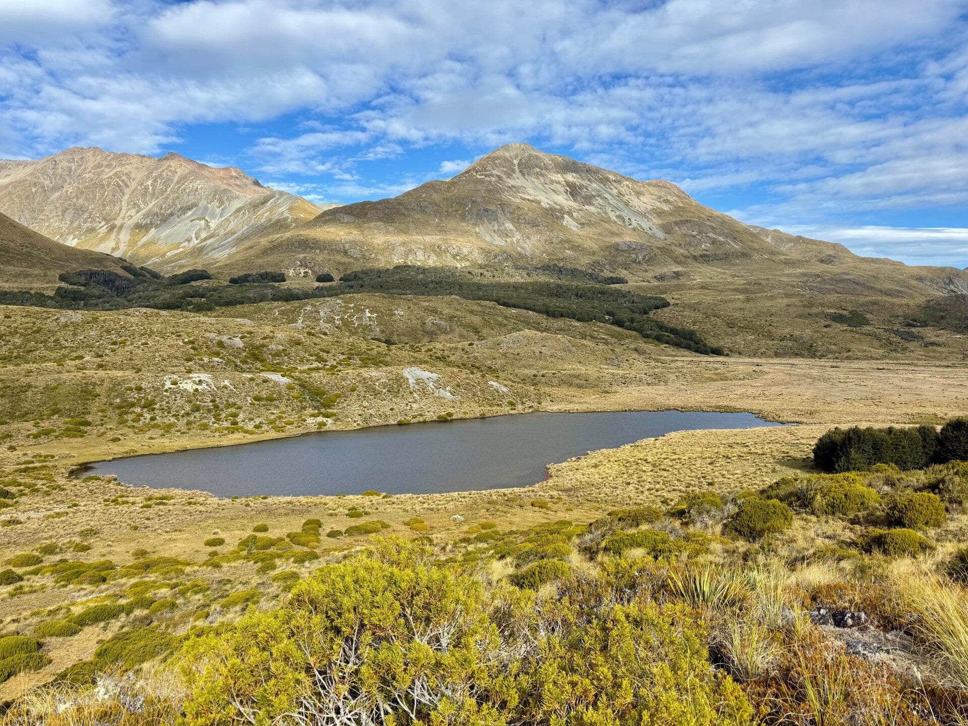 Les paysages sont magnifiques, la vallée est ouverte avec la rivière bleutée qui coule en son centre, les étendues d’herbe jaunie et les montagnes basses couvertes de pierres en arrière-plan. A la mi-journée, nous atteignons les lacs Mavora, le lac nord qui est le plus grand des deux s’étalant sur une douzaine de kilomètres, puis le lac sud plus petit, bordé de forêt.